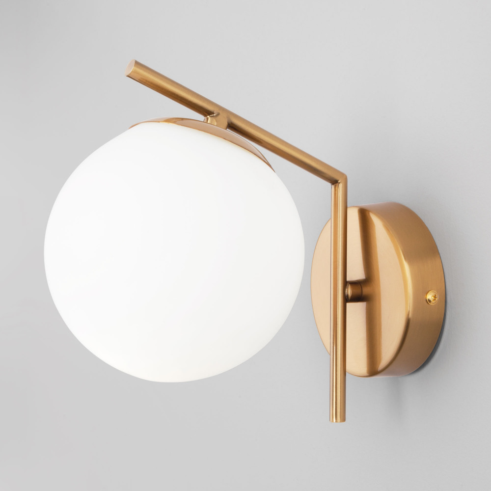 Каркас бра исполнен из прочного металл, цвет арматуры - латунь, цвет плафона - белый, что придает этому светильнику благородности.
