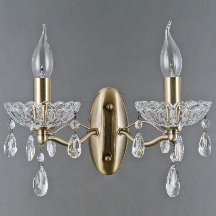 Каркас настенного светильника создан из прочного металл, хрусталь, цвет арматуры - бронзовый, прозрачный, цвет плафона - , что придает этому светильнику гармоничности.