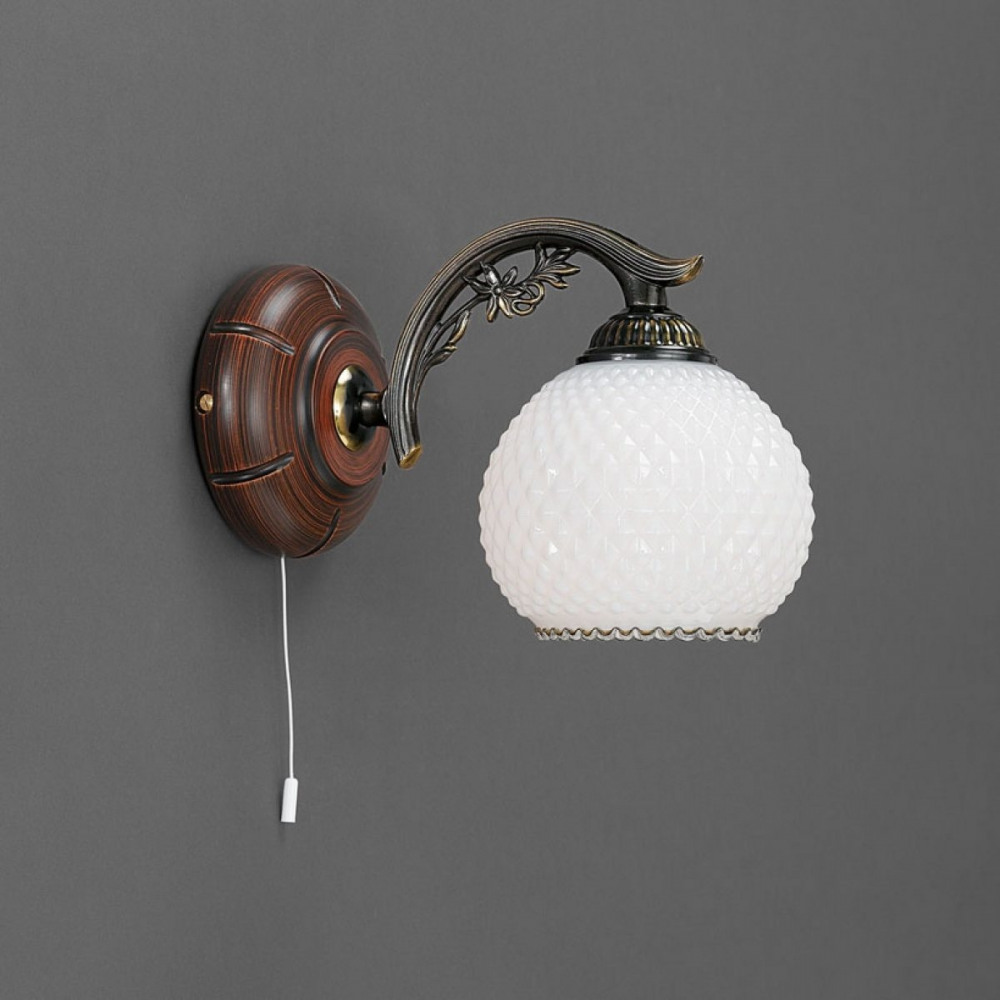 Каркас настенного светильника реализован из надёжного металл, цвет арматуры - бронза, цвет плафона - белый, что придает этому светильнику изысканности.