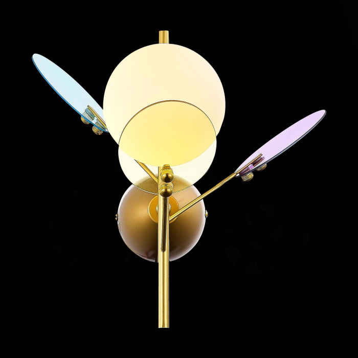 Корпус настенного светильника исполнен из качественного металл, цвет корпуса - золото, цвет плафона - белый, что придает этому светильнику гармоничности.
