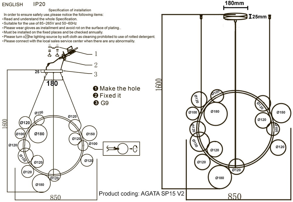 Для создания приятного освещения в светильнике предусмотрены лампочки в количестве 15 шт. с цоколем G9 и общей мощностью 75 Вт., что обеспечивает приятное освещение помещения площадью до 5 кв.м.