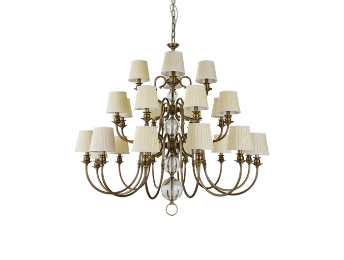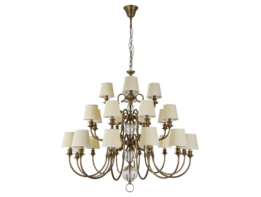 По конструкции это люстра на цепи: подвесной монтаж обеспечивает солидный визуальный «жест» и помогает правильно посадить светильник в пространстве с высокими потолками. Диаметр 1300 мм и высота 1200 мм подчёркивают масштаб, а патроны E14 позволяют укомплектовать люстру привычными лампами накаливания. При использовании 24 ламп по 60 W суммарная мощность достигает 1440 W — этого достаточно, чтобы уверенно осветить крупную зону без дополнительных светильников. Степень защиты IP20 соответствует эксплуатации в сухих жилых помещениях.