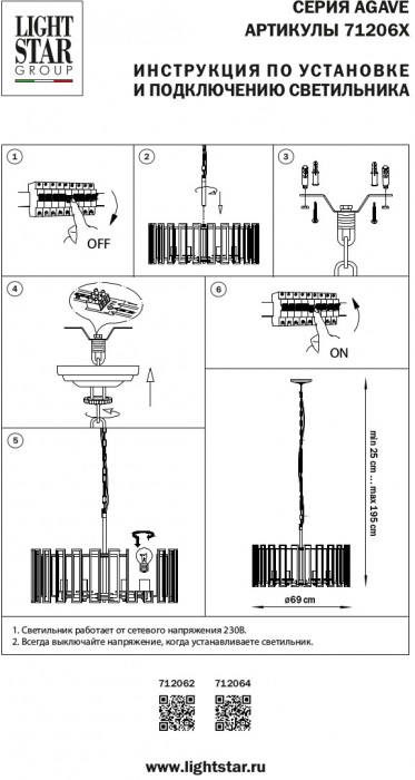 Итак, подвесная люстра 712062 – это превосходный и фирменный продукт от бренда Lightstar (Италия). Сочетание эстетичного дизайна и неповторимого мастерства делает его выдающимся выбором для вашего дома.