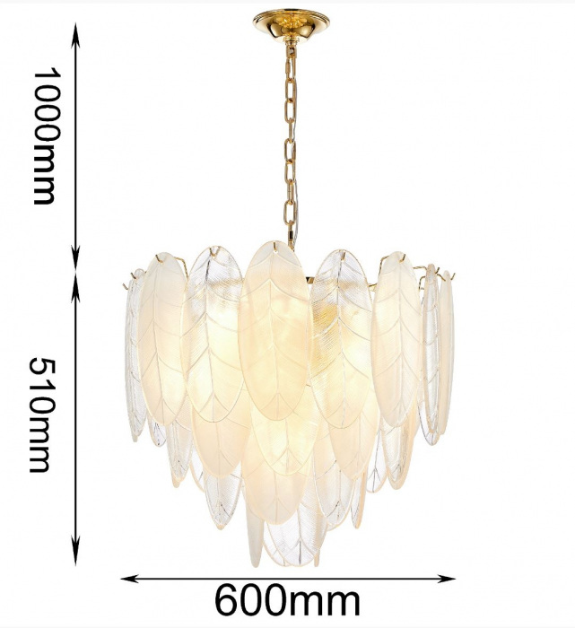 Размеры светильника: ширина 600 мм, высота мм. - такие габариты позволяют люстре гармонично смотреться как в просторных, так и в небольших помещениях.