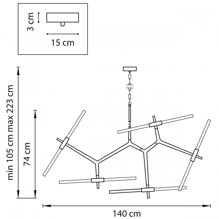 Размеры светильника: ширина 1400 мм, высота 740 мм. - такие габариты позволяют люстре идеально смотреться как в просторных, так и в небольших помещениях.
