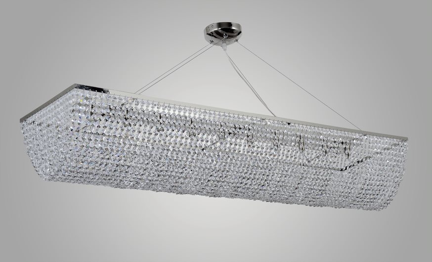 Линейная форма длиной 1200 мм и высотой 250 мм гармонично смотрится над обеденным столом или барной стойкой, равномерно заливая пространство мягким сиянием хрусталя. Если вы присматриваете люстру на цепи или люстру на штанге в едином стиле, серия Milano предлагает родственные решения для целостного интерьера — удобно комбинировать и собирать систему освещения из одной коллекции.