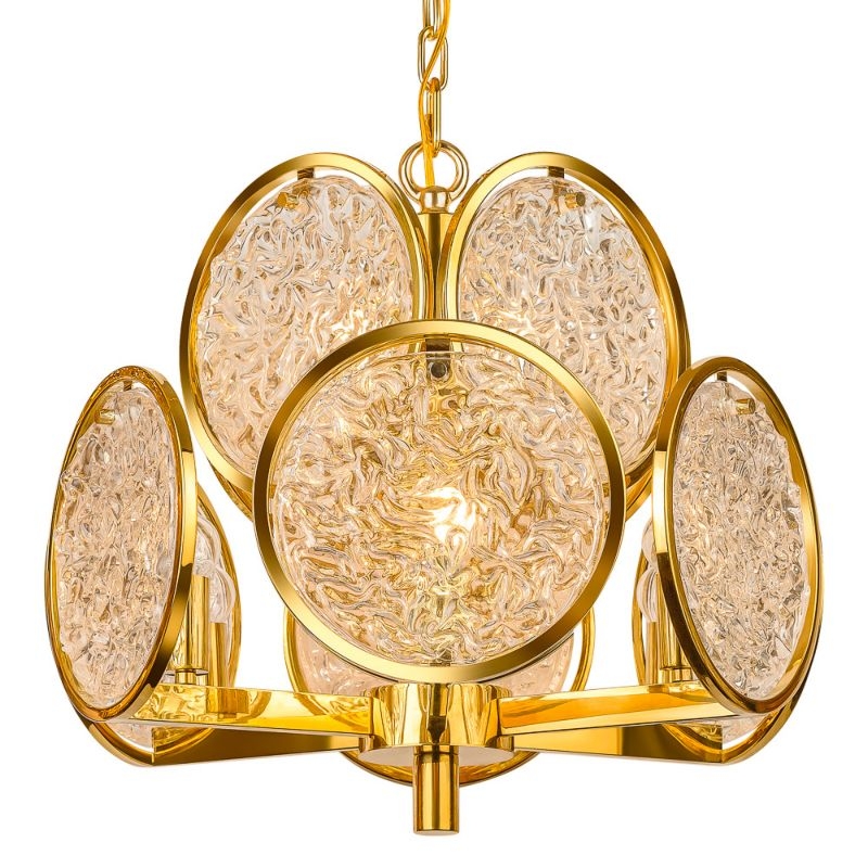 Каркас подвесной люстры исполнен из высококачественного металла, а золотой цвет придаст вашему интерьеру элегантности. Плафон выполнен в прозрачном цвете, что добавляет модели легкости, изысканности и завершенность образа.