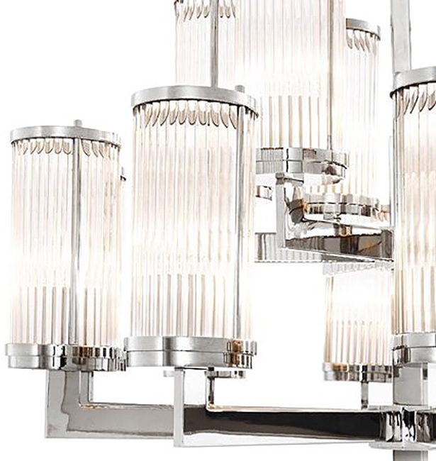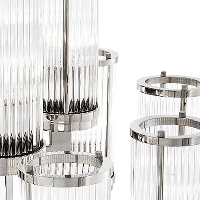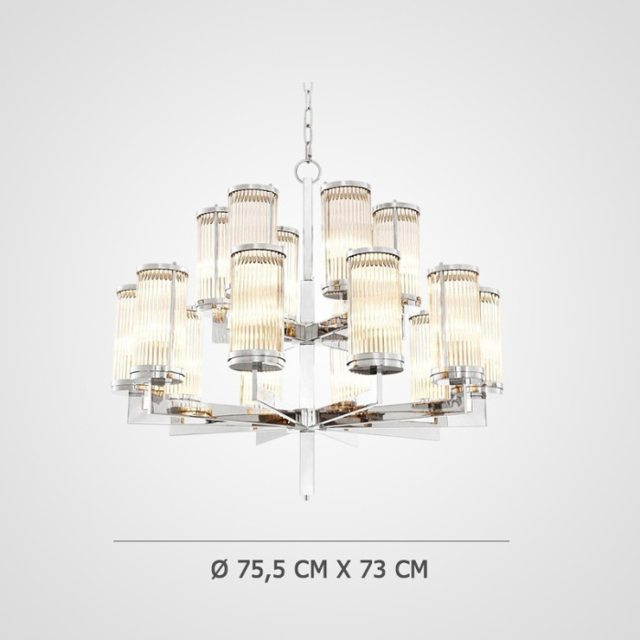 Диаметр D75 делает модель заметным акцентом, не перегружающим интерьер: она уверенно собирает пространство и работает как центральная группа освещения. Прозрачное стекло плафонов дает чистый, равномерный свет, а серебряный металл арматуры легко сочетается с холодной палитрой отделки и зеркальными поверхностями.