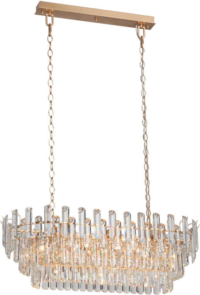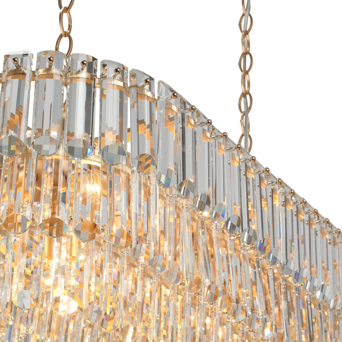 Каркас подвесной люстры исполнен из надежного металла, а золотой цвет добавит вашему интерьеру теплоты. Плафон выполнен в прозрачном цвете, что добавляет модели легкости, изысканности и завершенность образа.