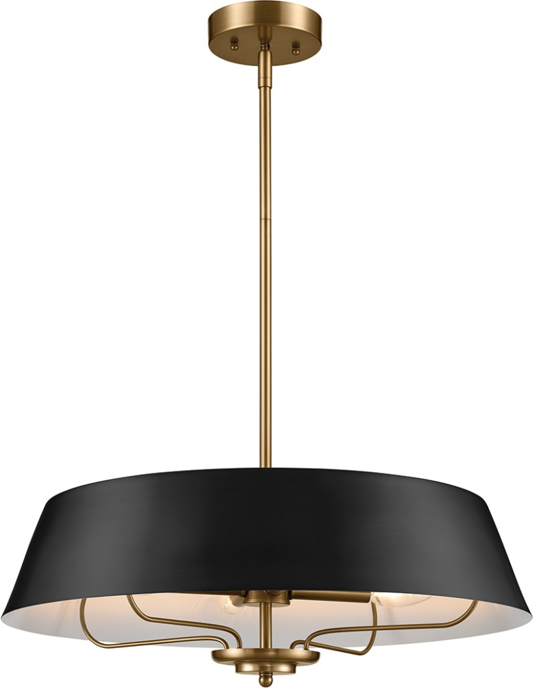 Корпус подвесной люстры создан из надежного металла, а латунный цвет добавит вашему интерьеру теплоты. Плафон выполнен в чёрном цвете, что добавляет модели легкости, элегантности и завершенность образа.
