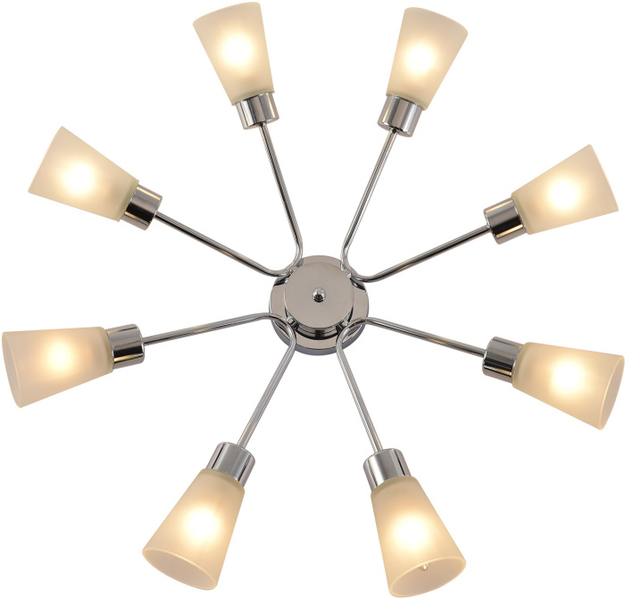 Для создания яркого освещения в светильнике предусмотрены лампочки в количестве 8 шт. с цоколем E14 и общей мощностью 320 Вт., благодаря чему обеспечивается отличное освещение для помещений площадью до 48 кв.м.