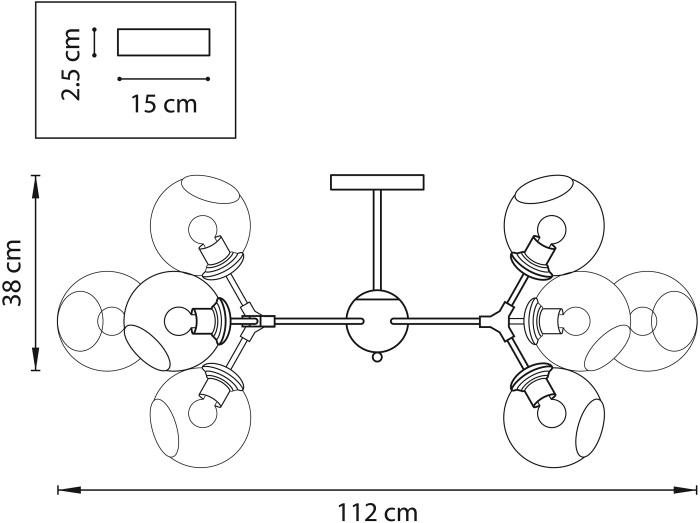 Размеры светильника: ширина 1120 мм, высота 380 мм. Такие габариты позволяют люстре прекрасно вписываться как в просторные, так и в небольшие помещения.