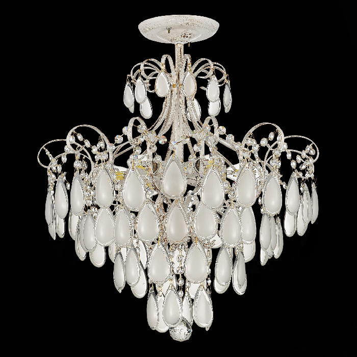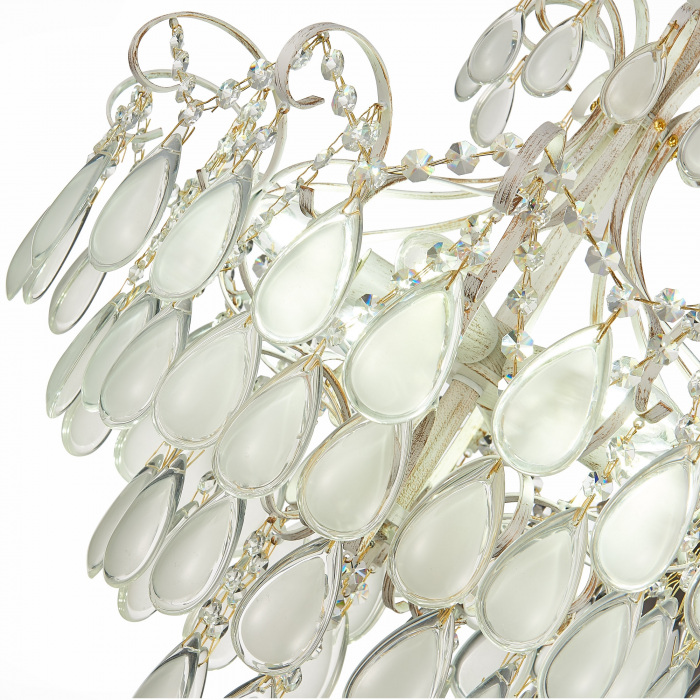 Корпус хрустальной люстры создан из премиального металла, золотой цвет привносит в ваш интерьер теплоту. Плафон в белом цвете подчеркивает общую композицию, добавляя модели легкость и элегантность.