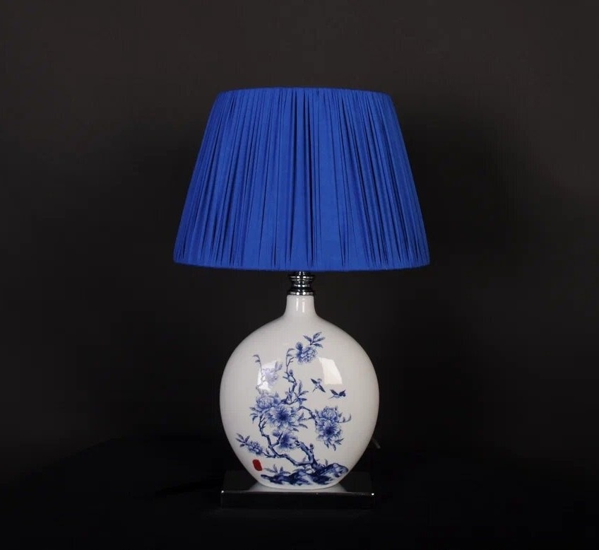 Каркас данной модели реализован из надёжного металла, керамика, а его белый цвет придаст вашему интерьеру гармоничности и теплоты. Плафон выполнен в синем цвете, что придает модели легкости и элегантности.