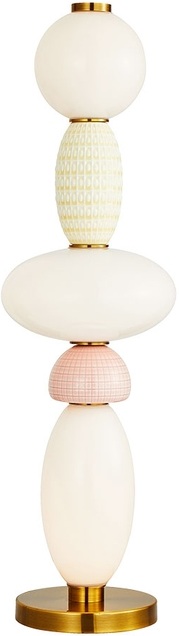 Каркас данной модели реализован из прочного металла, а его латунный цвет придаст вашему интерьеру гармоничности и теплоты. Плафон выполнен в белом, розовом цвете, что придает модели легкости и гармоничности.