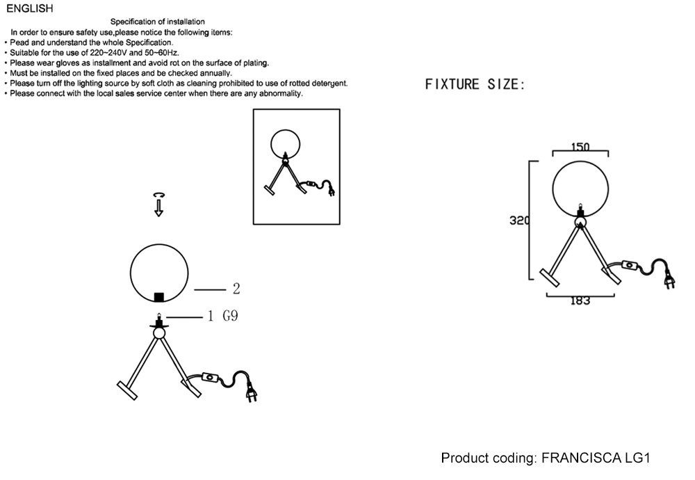 Размеры этой лампы – ширина 150 мм., высота 320 мм. Она идеально подойдёт для комнаты площадью до 1 квадратных метров. Для создания подходящего освещения здесь использовано 1 ламп с цоколем G9 и общей мощностью 7 Вт.