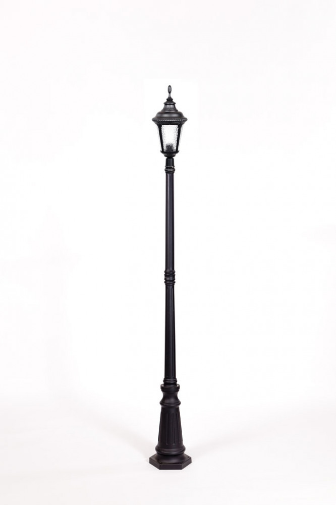 Каркас уличного фонаря создан из качественного металла, цвет корпуса - чёрный, цвет плафона - прозрачный, что придает этому светильнику изысканности.