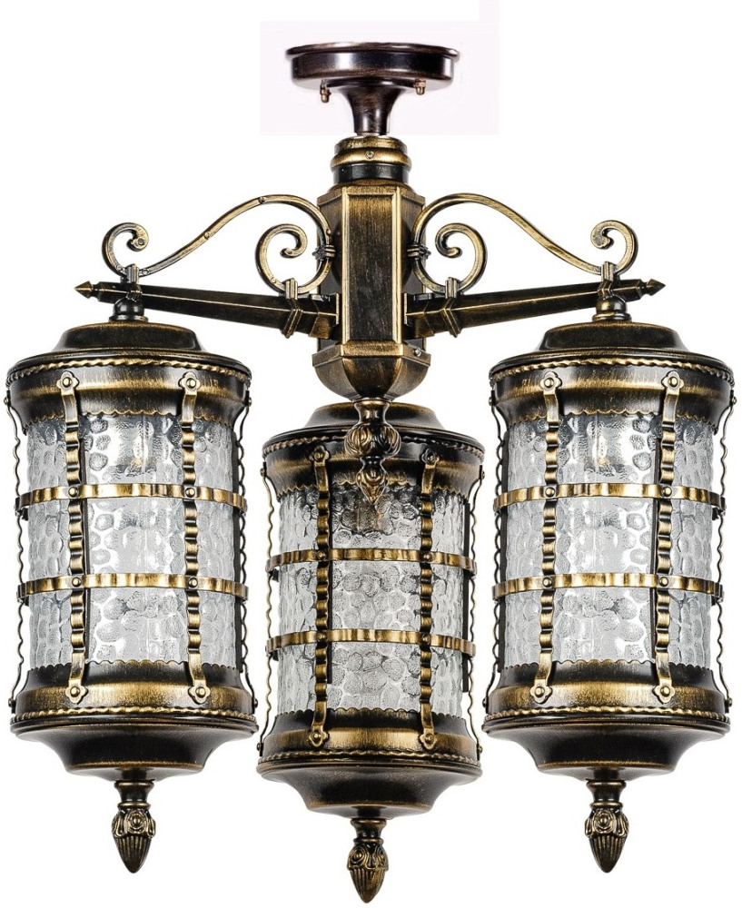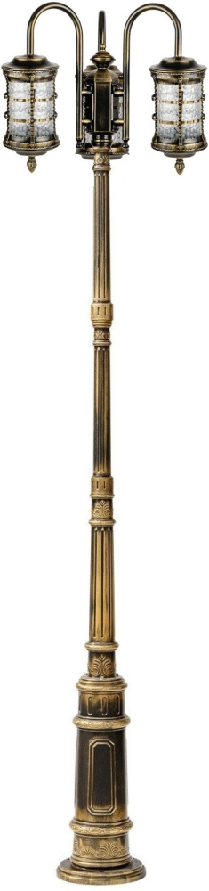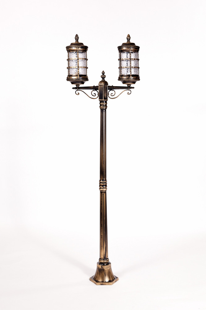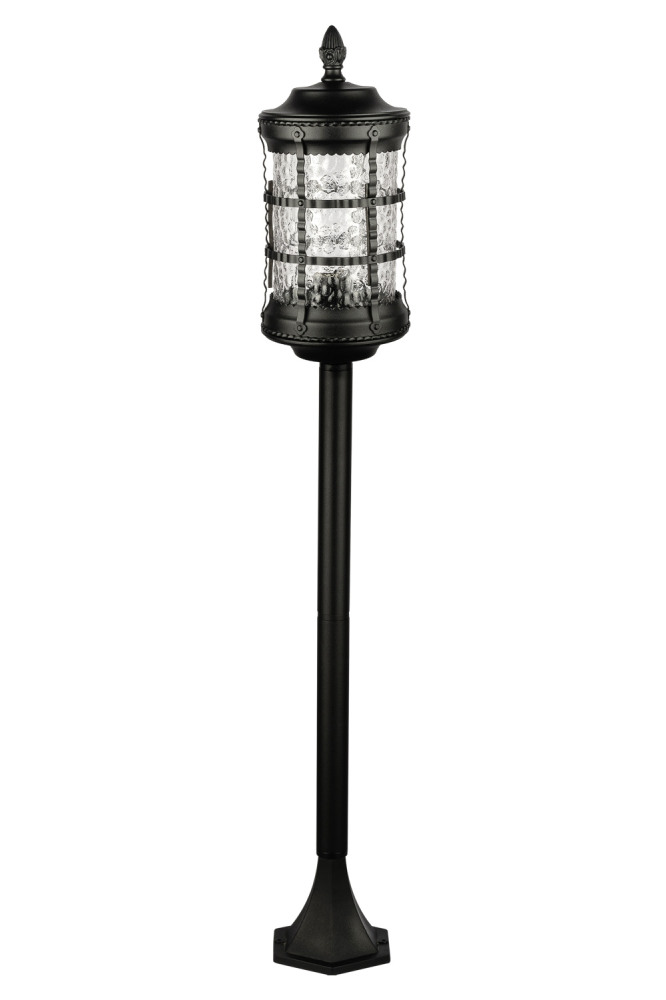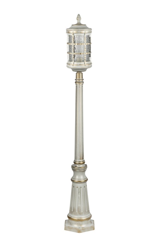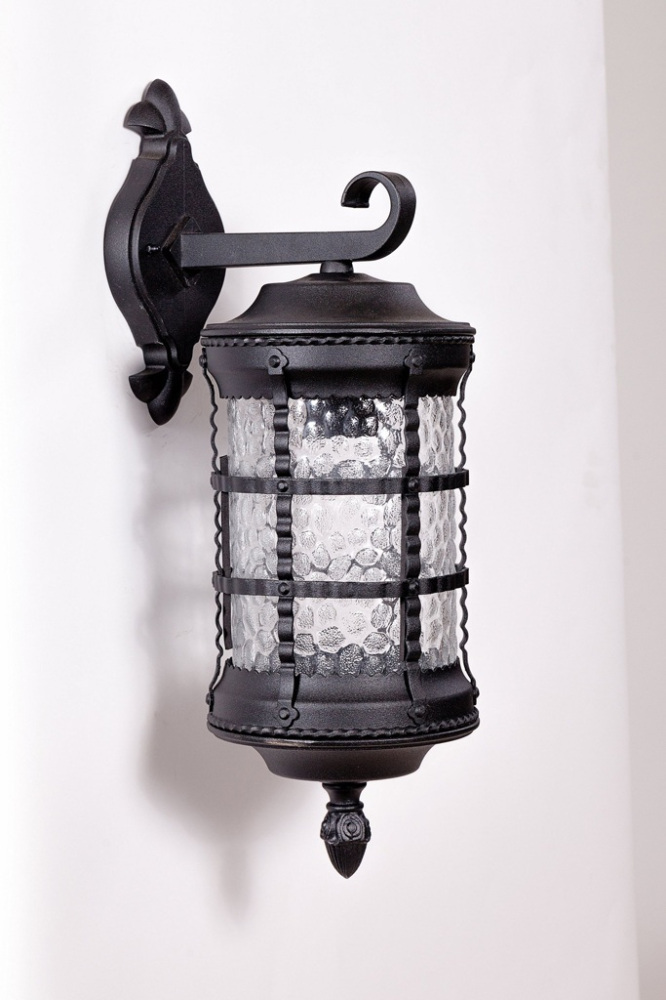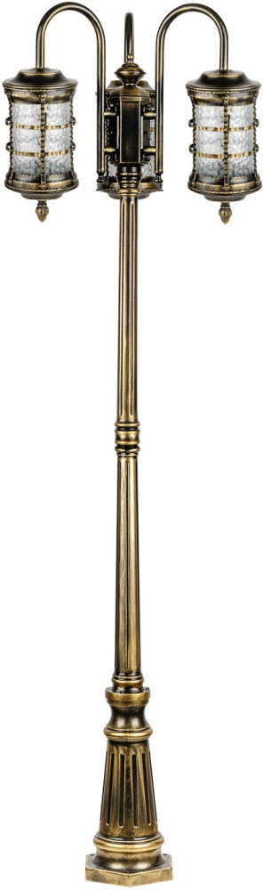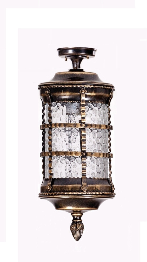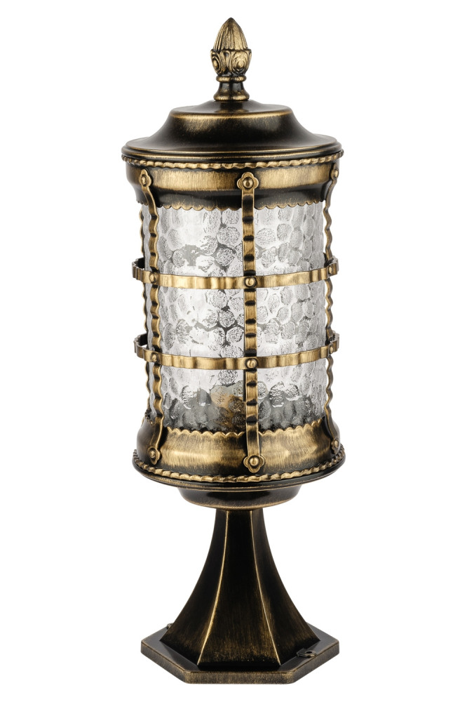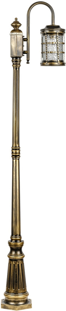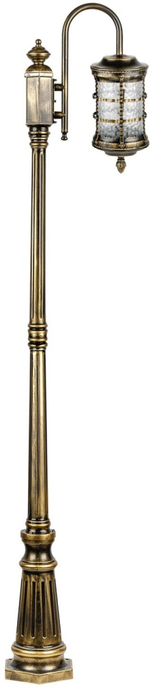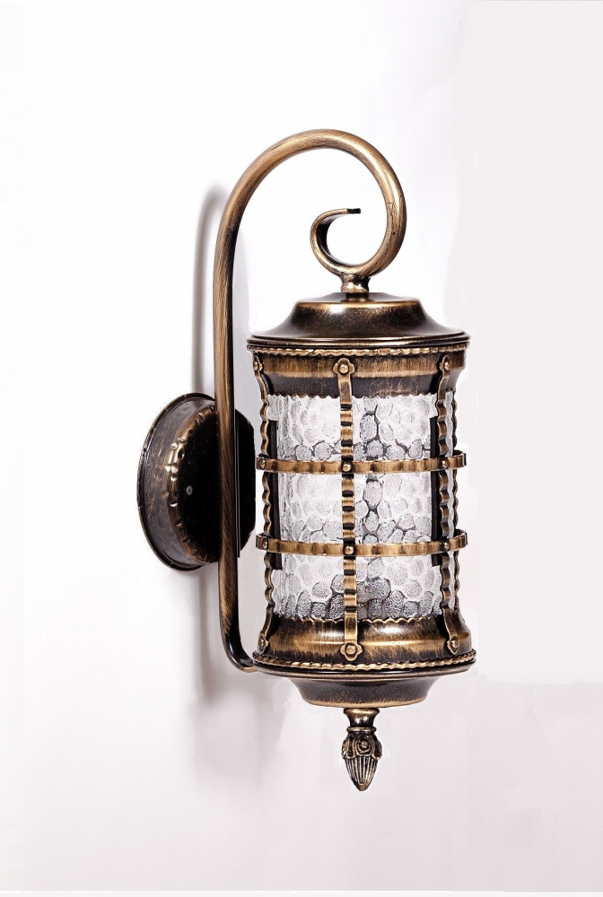 Светильник выполнен из прочного металла с патинированной арматурой, что обеспечивает долговечность и устойчивость к внешним воздействиям. Прозрачный стеклянный плафон в форме цилиндра направлен вниз, обеспечивая равномерное освещение площади до 5 квадратных метров.
