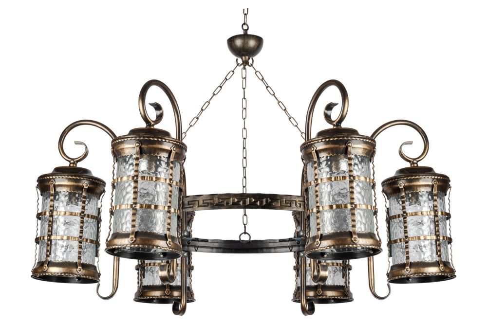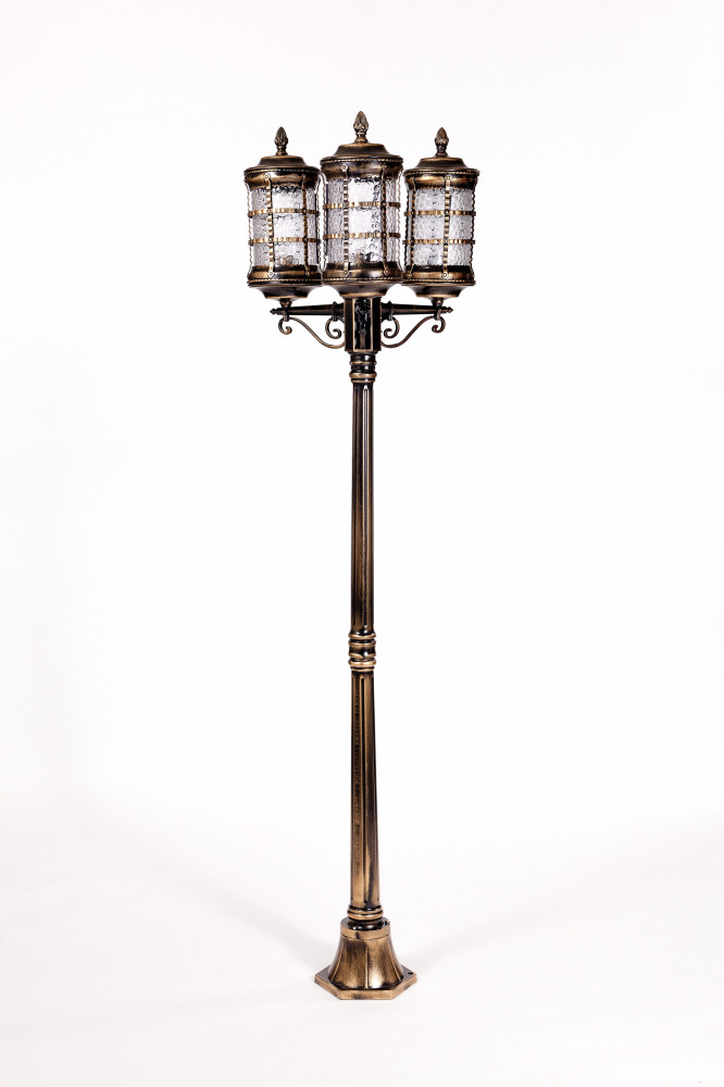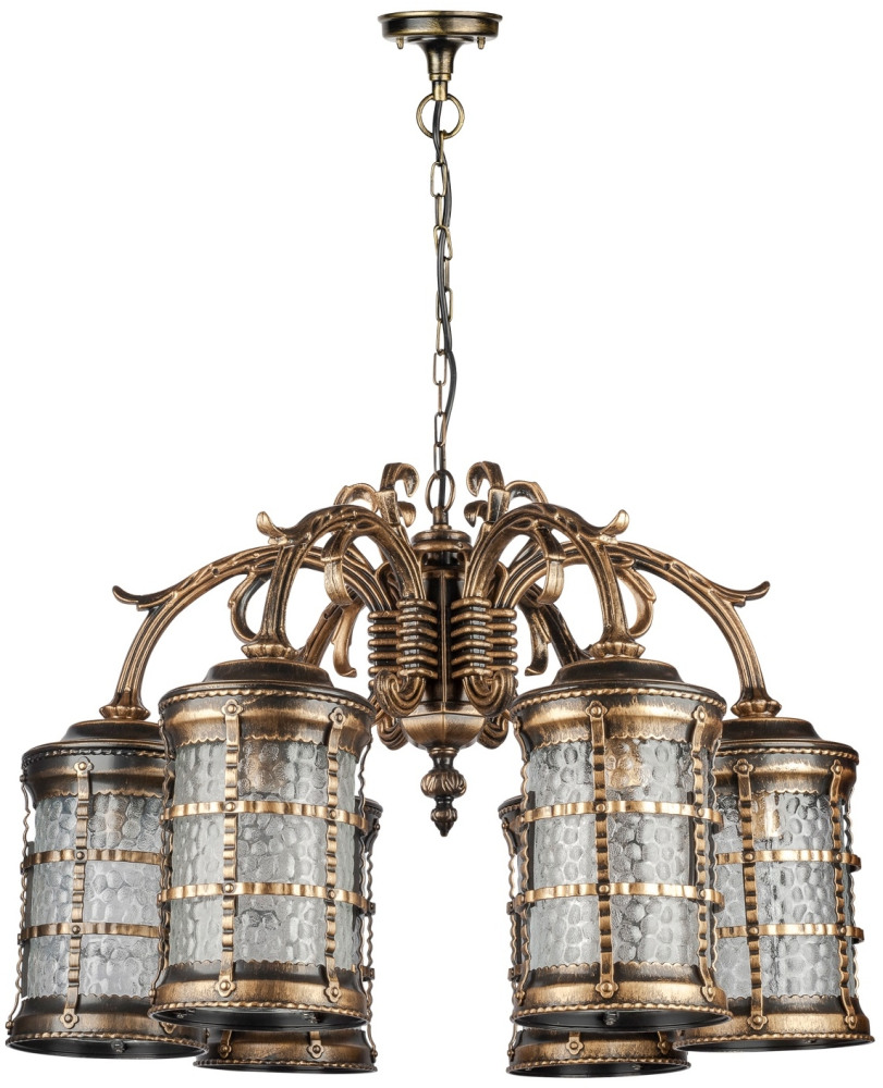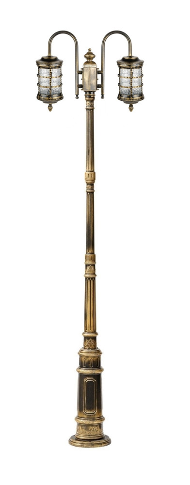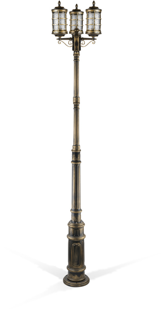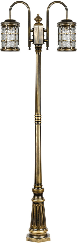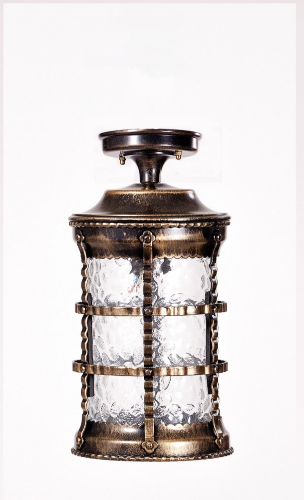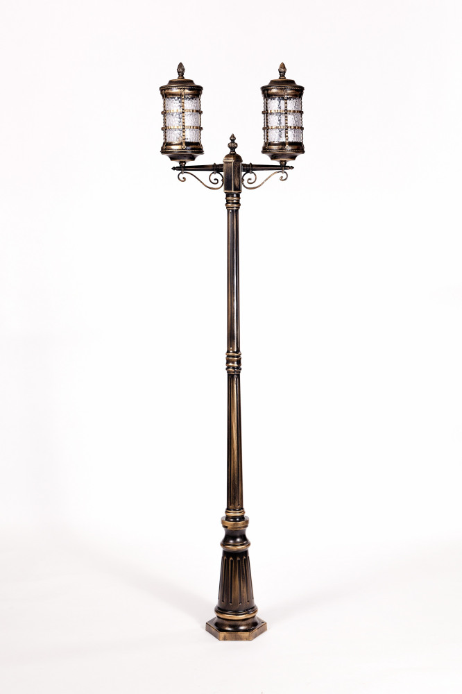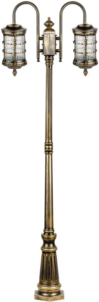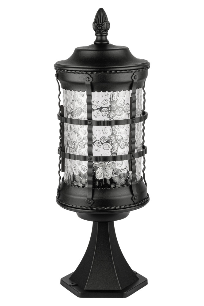 Светильник выполнен из прочного металла с патинированной арматурой, что обеспечивает долговечность и устойчивость к внешним воздействиям. Прозрачный стеклянный плафон в форме цилиндра направлен вниз, обеспечивая равномерное освещение площади до 5 квадратных метров.