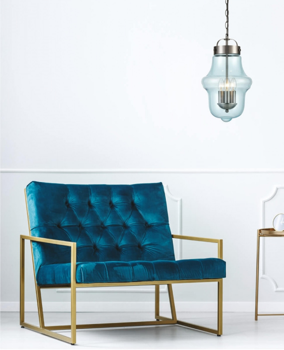 Каркас данной модели исполнен из прочного металла, а его никель/хром цвет придаст вашему интерьеру гармоничности и теплоты. Плафон выполнен в голубе цвете, что придает модели легкости и изысканности.