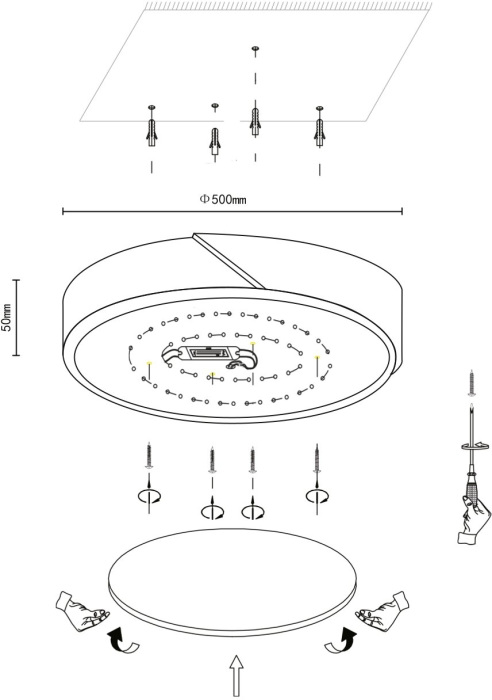 Размеры этого светильника – ширина 500 мм., высота 50 мм. Он идеально подойдёт для комнаты площадью до 17 кв.метров. Для создания необходимого освещения здесь использовано 1 ламп с цоколем LED и общей мощностью 48 Вт.