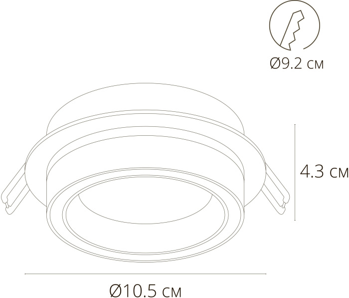 Размеры этого светильника – ширина 105 мм., высота 43 мм. Он идеально подойдёт для комнаты площадью до 2 квадратных метров. Для создания необходимого освещения здесь использовано 1 ламп с цоколем GX53 и общей мощностью 15 Вт.
