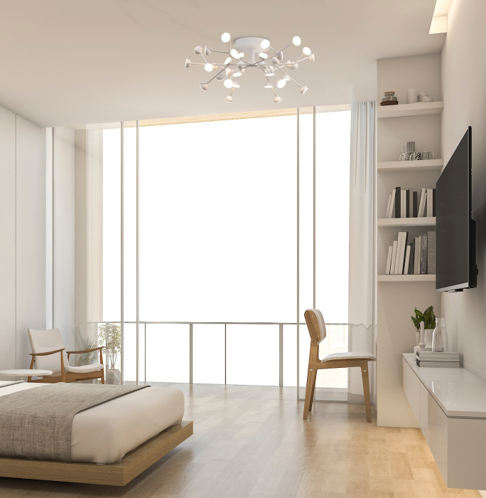Эта модель светодиодной люстры для гостиной гармонично сочетается с интерьерами, оформленными в стиле современный. Благодаря своему универсальному дизайну, она также замечательно дополнит и в других стилях, придавая вашей комнате дизайнерский шарм.