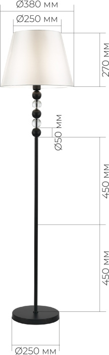 Размеры этого торшера – ширина 380 мм., высота 1470 мм. Он идеально подойдёт для комнаты площадью до 2 кв.метров. Для создания подходящего освещения здесь использовано 1 ламп с цоколем E27 и общей мощностью 40 Вт.
